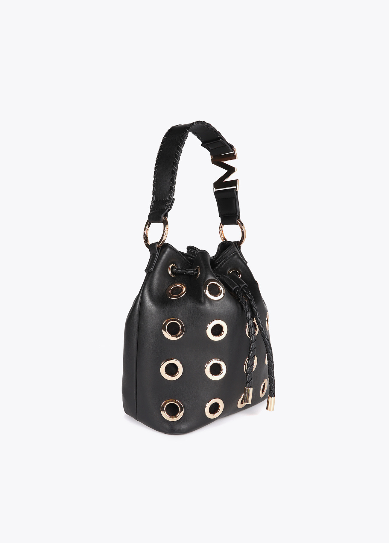 Bolsa com ilhós metálicos circulares. Alça trançada e fecho ajustável. Detalhe de logotipo metálico na alça. Design moderno e sofisticado.
