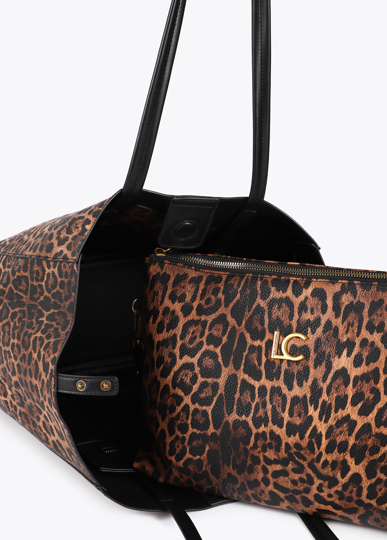 Bolsa shopper espaçosa com estampa de leopardo. Apresenta detalhes em metal com logo LC. Fabricada em material durável com alças longas para conforto. Interior amplo com fechamento de zíper.