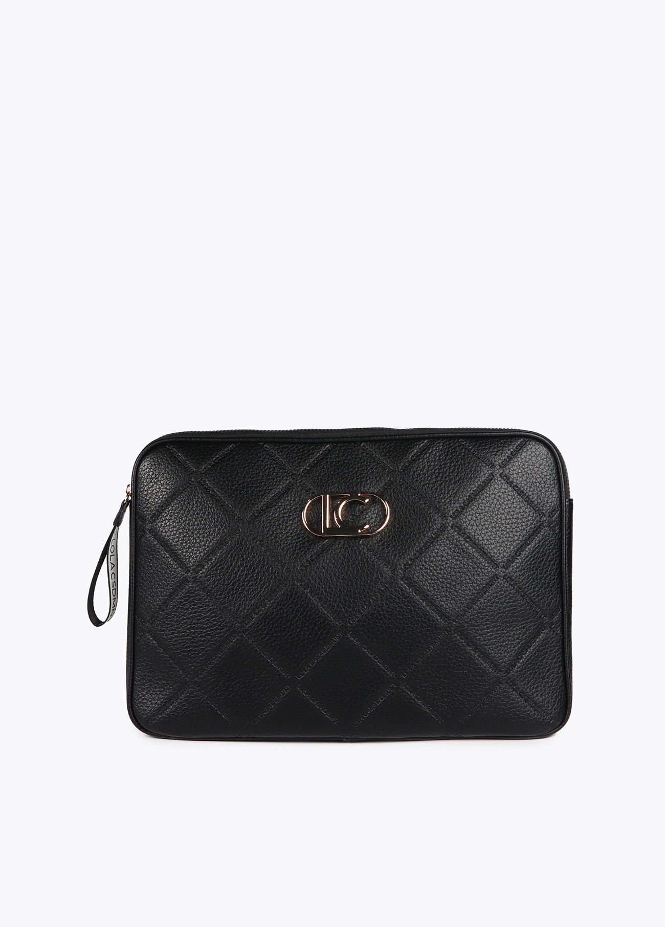 Capa para computador com design de losangos em relevo e monograma metálico. Feita de material resistente, fecho de zíper e interior acolchoado. Ideal para proteger o seu dispositivo com sofisticação.