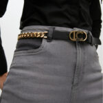 Cinto elegante com corrente dourada e logo oval. Feito de material resistente e fecho ajustável. Ideal para adicionar um toque sofisticado a qualquer conjunto.
