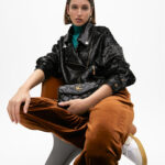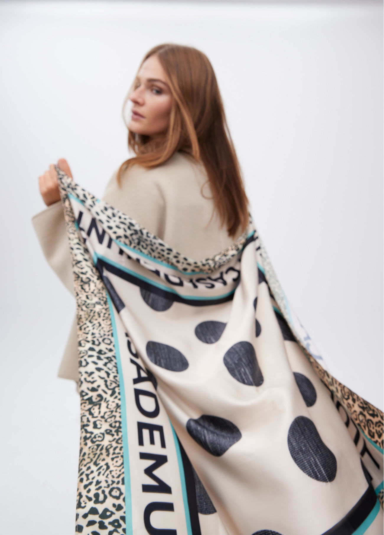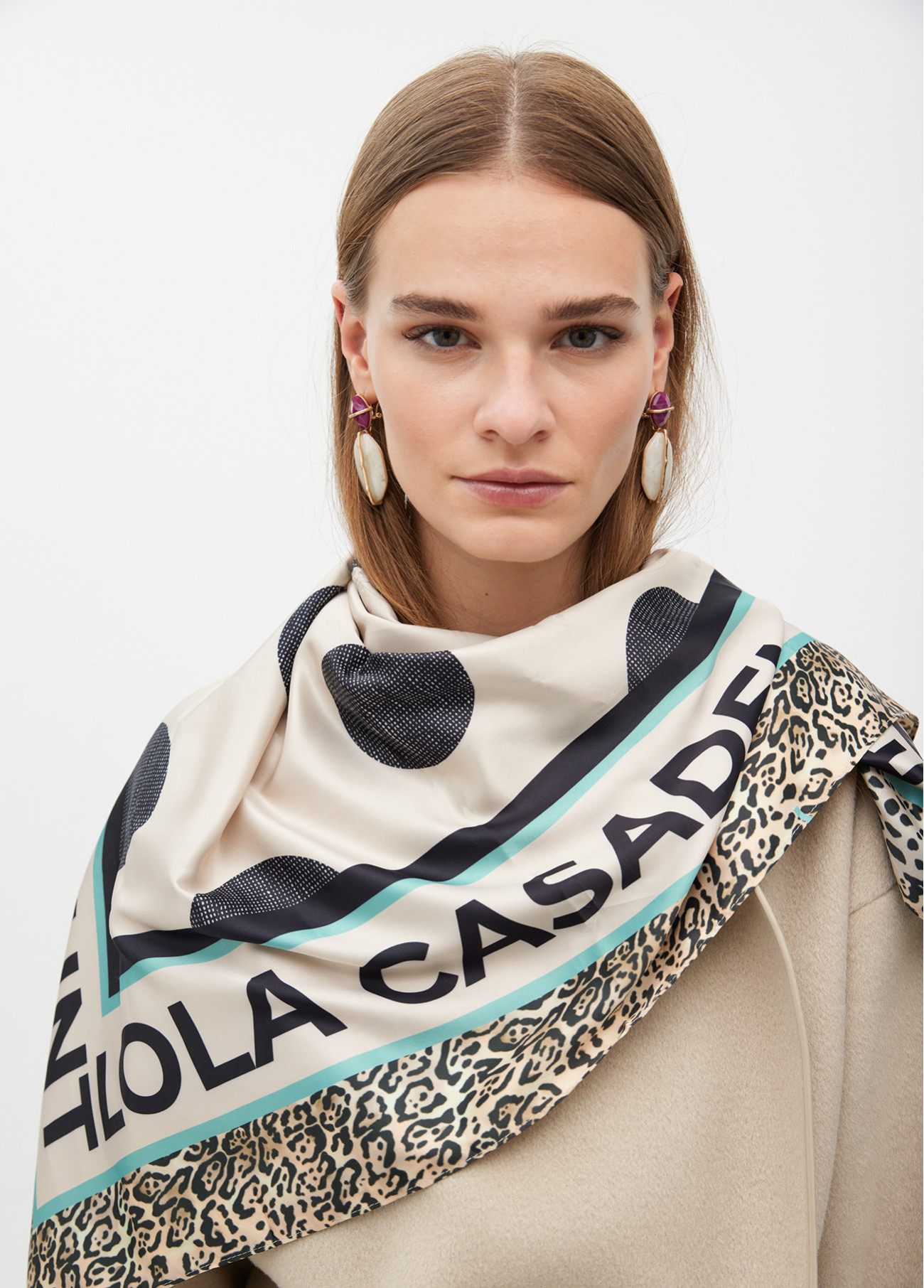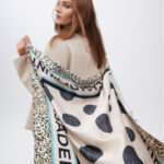 Lenço de seda macia com estampa vibrante de bolinhas e logotipo distintivo. Bordas com design animal print. Elegância e estilo combinados.