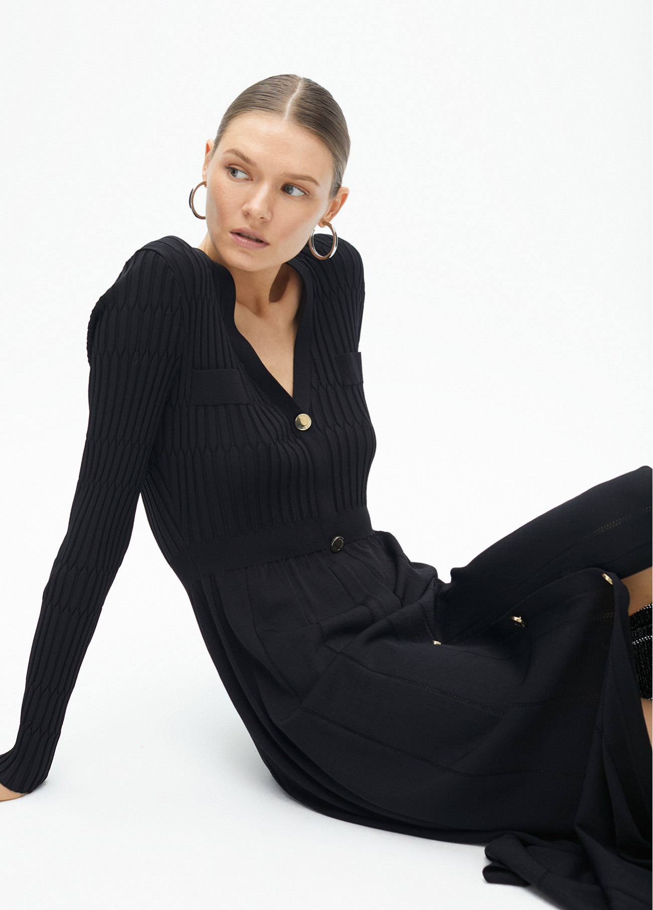 VESTIDO DE MALHA COM SAIA EVASÉ E BOTÕESDezembro 7, 2025