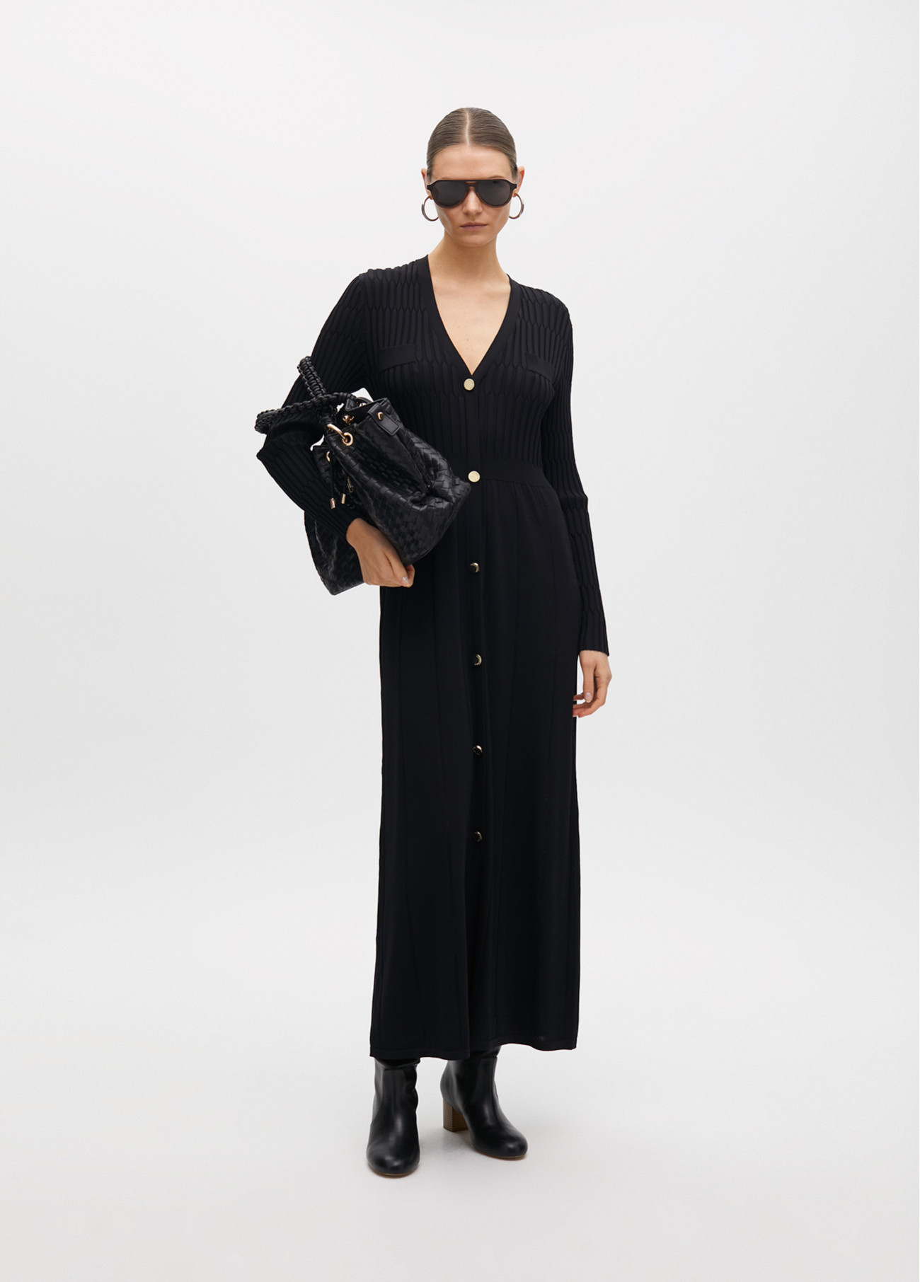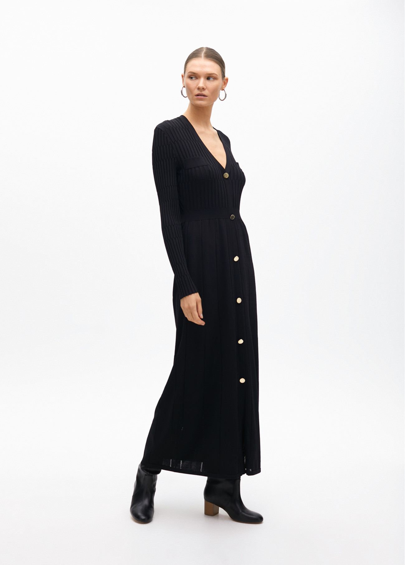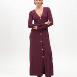 Vestido longo de malha com design evasé e botões dourados na frente. Possui mangas longas e decote em V para um visual sofisticado. Tecido de malha macio e elástico que se ajusta à figura. Perfeito para qualquer ocasião.